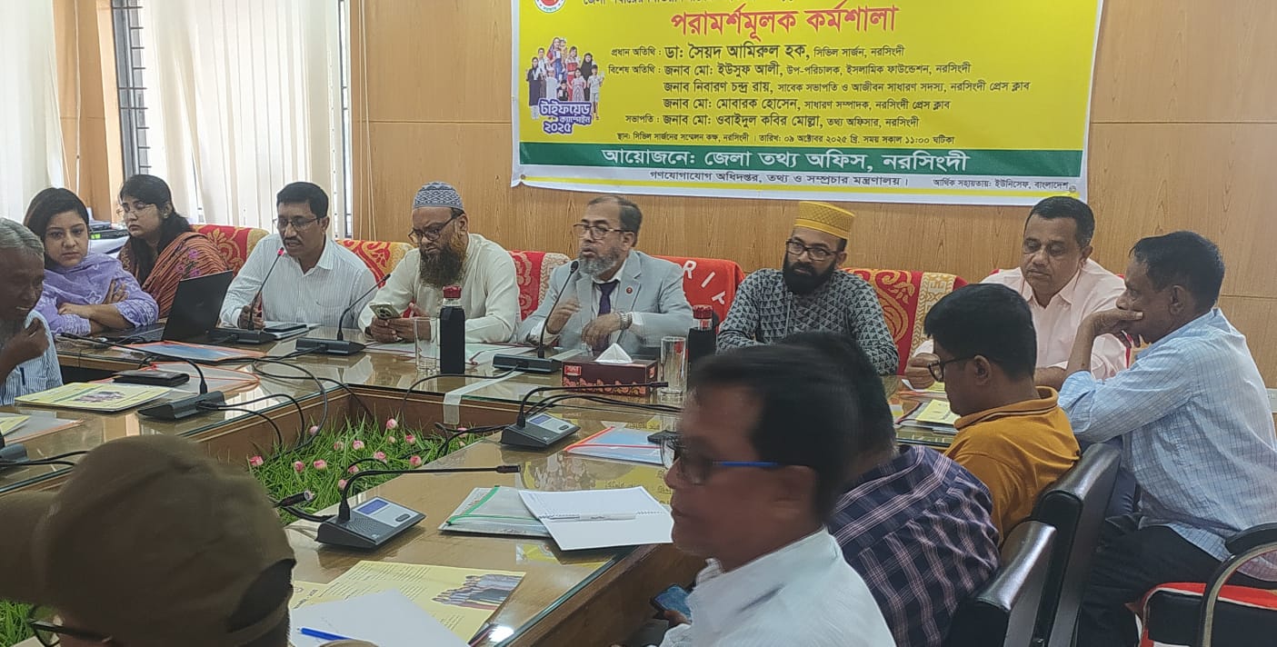 The chief guest at the workshop was Narsingdi Civil Surgeon Dr. Syed Amirul Haque Shamim. The special guests were, respectively, Deputy Director of Narsingdi Islamic Foundation Md. Yusuf Ali, former president and life general member of Narsingdi Press Club Nibaran Chandra Roy, and General Secretary of Narsingdi Press Club Md. Mobarak Hossain. Dr. Trisha Jafri presented the keynote address at the workshop held on behalf of the Department of Mass Communication under the Ministry of Information under the chairmanship of Narsingdi District Information Officer Md. Obaidul Kabir Mollah and moderated by Assistant Information Officer Afsana Akhter. Among others, journalists Fazlul Haque, Manzil A Millat, Hossain Ali, etc.