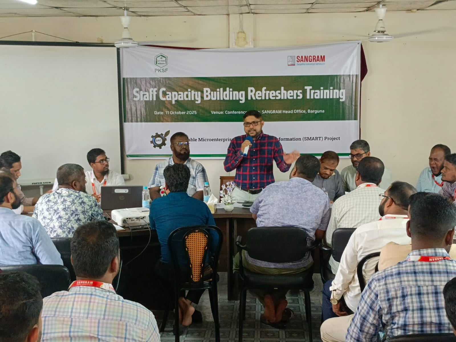 Md. Sanaullah Riyad, Barguna:: Under the “Sustainable Microenterprise and Resilient Transformation (SMART)” project implemented by Sangram in collaboration with Palli Karma-Sahayak Foundation (PKSF) and the World Bank, a day-long “Staff Capacity Building Refreshers Training” held last Saturday (October 11) with managers, accountants and field workers of 11 branches of Sangram under the project.