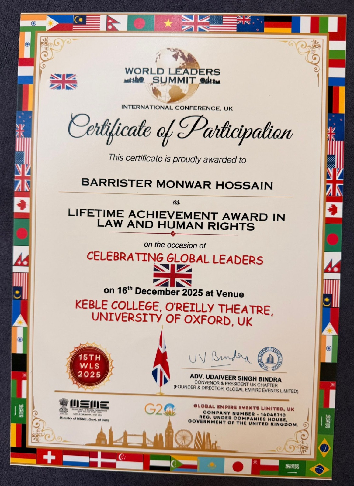 Bangladeshi son Barrister Monwar Hossain has received the Lifetime Achievement Award at an international conference in Oxford